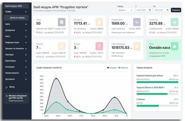 Облік надходжень, переміщень та реалізації товарів допомагає стежити за роботою торгової точки. Дивіться виторг, прибуток, залишки, рентабельність – дані за будь-який період по магазину, групі товарів або по конкретній позиції.