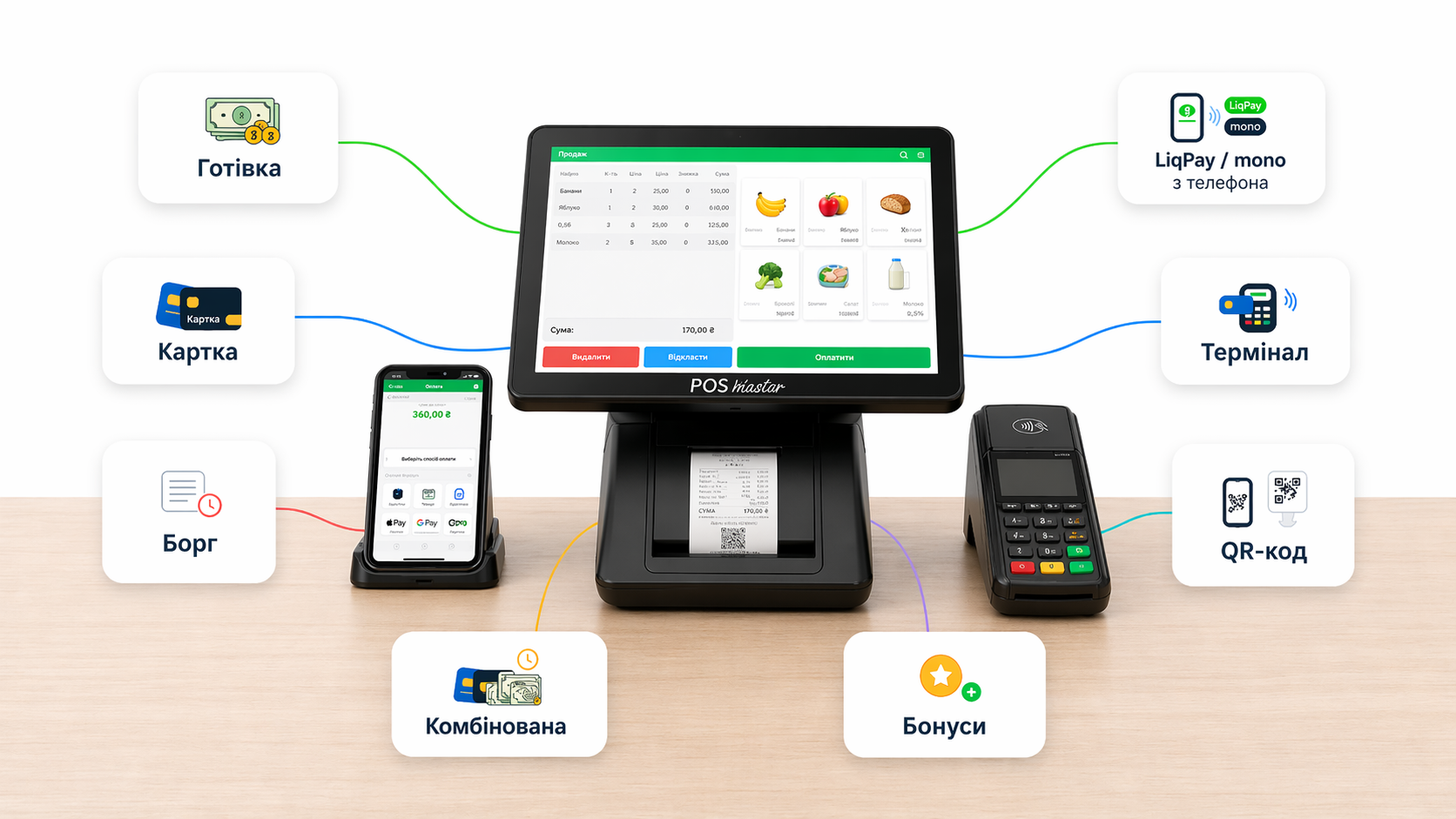 Програма підтримує різні форми оплати (готівка, безготівка, борг, робота з банківськими терміналами, комбінована оплата, оплата бонусами), а також оплату ПриватБанк LiqPay в Android модулі. Це дозволяє приймати безготівкові платежі без термінала, просто з телефона або планшета.