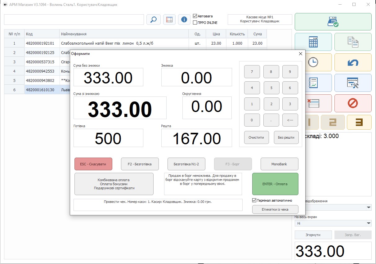 Зрозумілий інтерфейс і швидка робота. Касира можна навчити за годину. Підтримка широкого спектра обладнання: ваги, табло, реєстратори, банківські термінали, принтери чеків. Різні форми оплати. Зацікавило? Завантажте демонстраційну версію (Windows) або замовте безкоштовну повну версію програми.