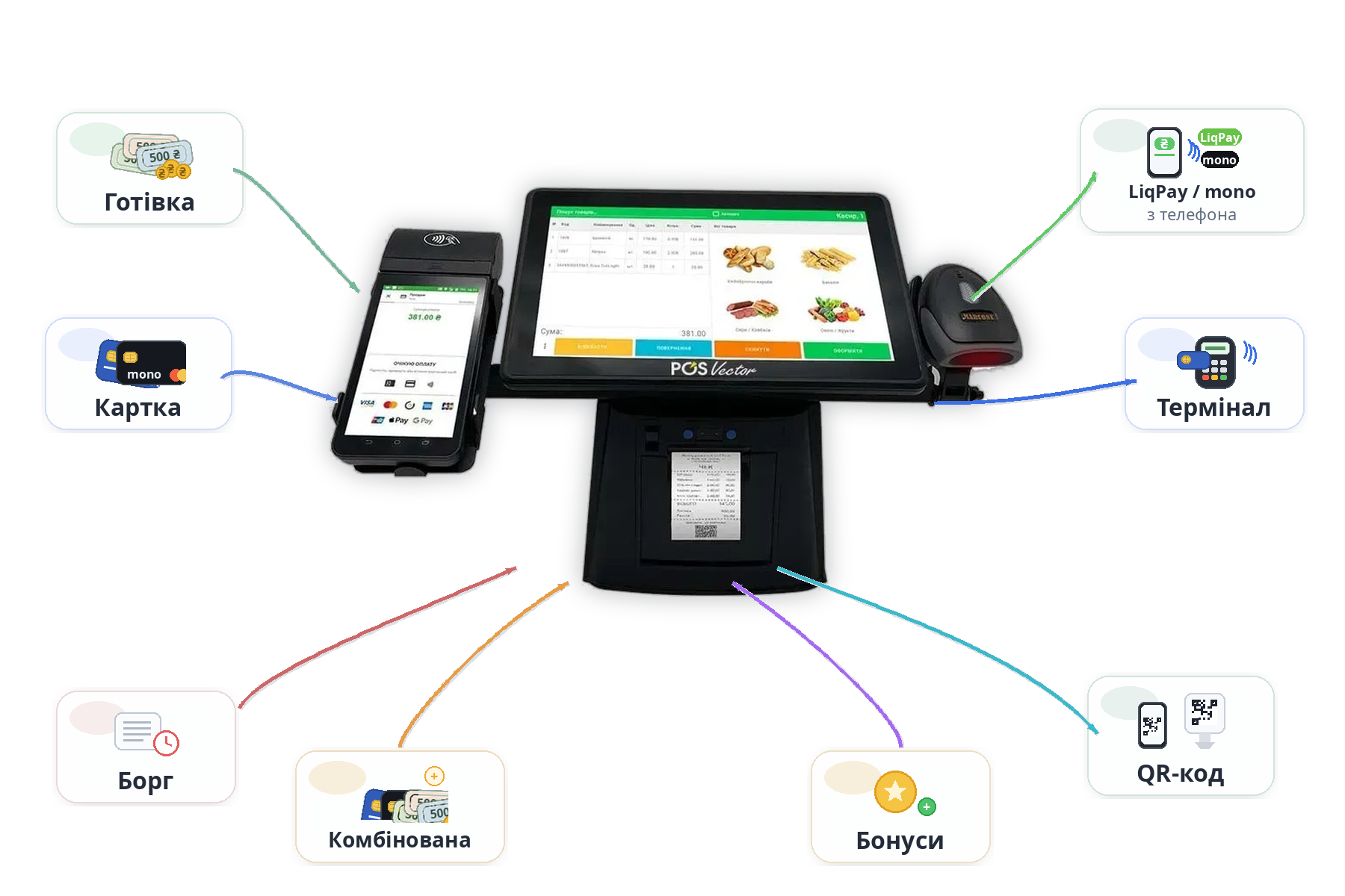 Програма підтримує різні форми оплати (готівка, безготівка, борг, робота з банківськими терміналами, комбінована оплата, оплата бонусами), а також оплату ПриватБанк LiqPay в Android модулі. Це дозволяє приймати безготівкові платежі без термінала, просто з телефона або планшета.