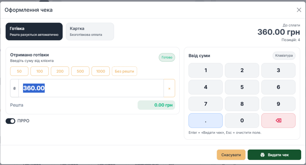 - Готівка: вводиться сума “отримано”, каса автоматично рахує решту. Є швидкі кнопки номіналів та “без решти”.
