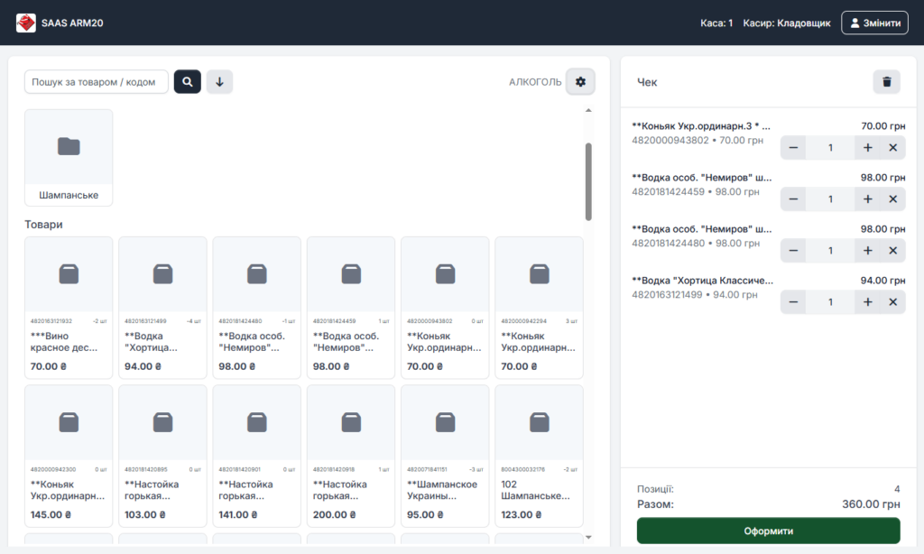 - Додайте товари в чек (категорії/пошук/код), відкоригуйте кількість/вагу.