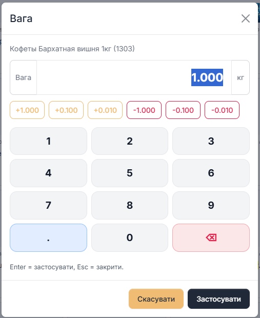 У блоці чека касир може швидко змінювати кількість (+ / −), видаляти позиції та бачити підсумок. Для вагових товарів передбачено окремий режим: введення ваги через зручне вікно з екранною клавіатурою та швидкими кроками.