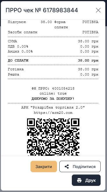 На мобільних це особливо зручно: чек можна роздрукувати через браузер або поділитися (якщо платформа підтримує Web Share). Також може формуватись PDF-версія чека для передачі клієнту.