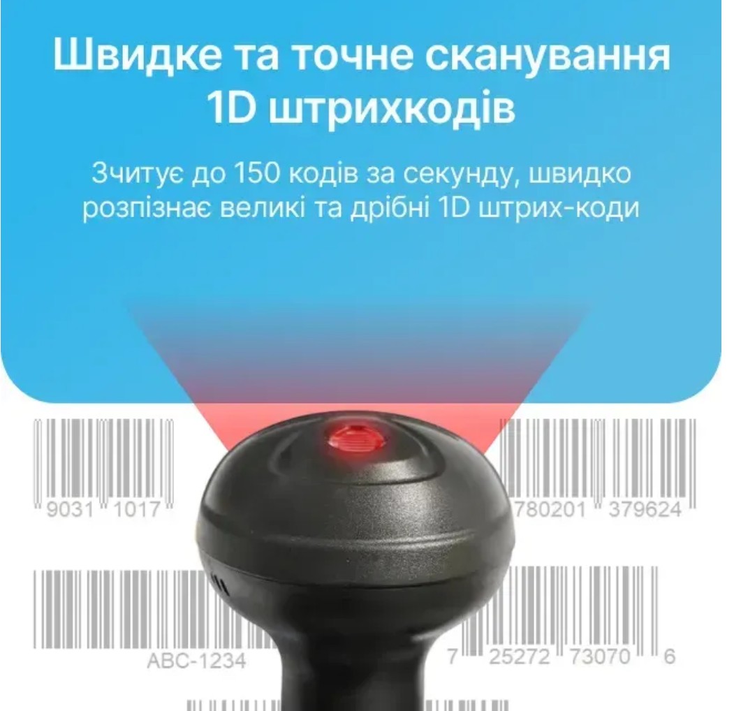 Зчитує до 150 кодів за секунду, швидко розпізнає великі та дрібні штрих-коди
