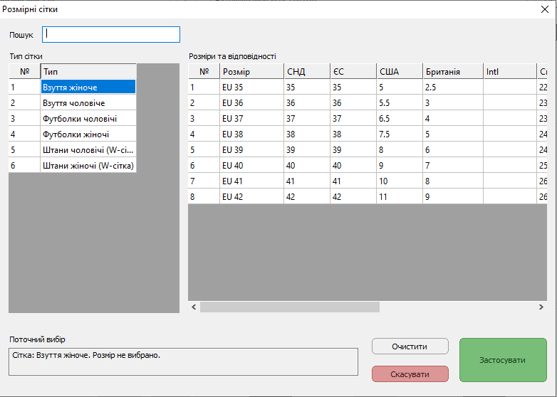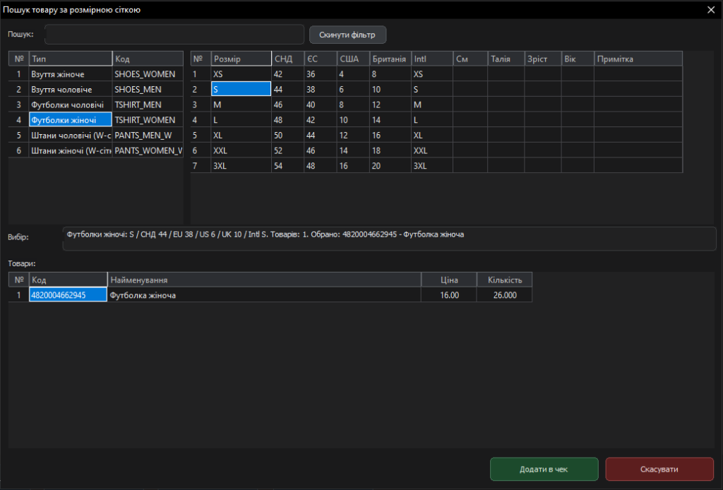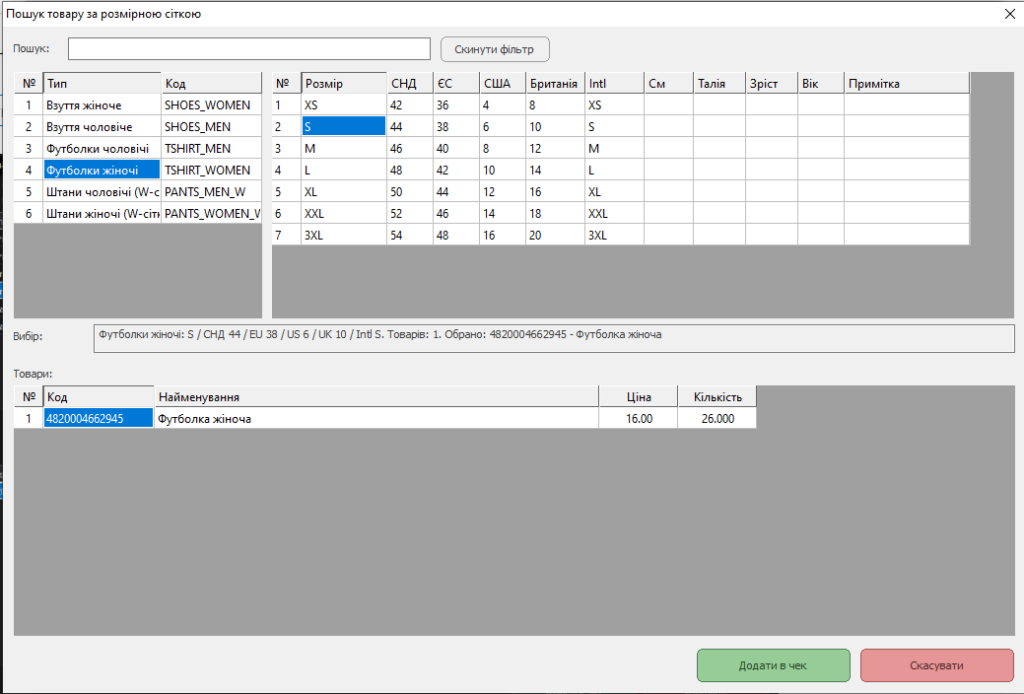 Це добре видно на практичних прикладах. Якщо покупець просить жіноче взуття 39 розміру, касир вибирає сітку для жіночого взуття, далі потрібний розмір і одразу бачить відповідні моделі. Якщо треба чоловіча футболка L, логіка така сама: вибір сітки, вибір розміру, список товарів. Якщо йдеться про штани, можна працювати вже через талію та довжину, що особливо зручно там, де звичайного «одного числа» недостатньо.