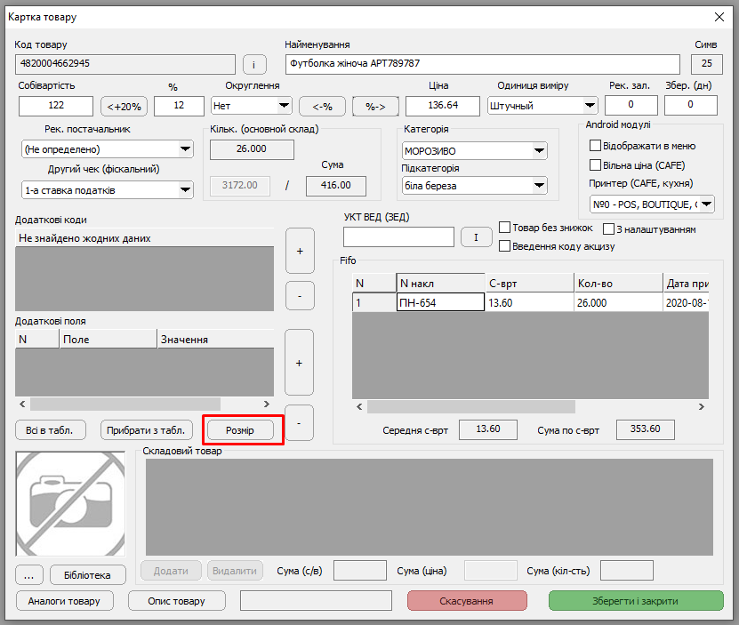Після збереження розмір видно в картці товару як окреме значення. Його легко перевірити ще до продажу: не треба знову відкривати довідники, згадувати, що саме мали на увазі при заповненні, або звірятися з нотатками.
