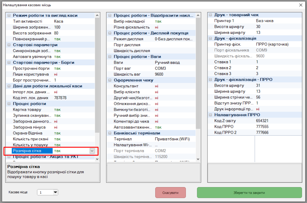 Коли картки товарів уже заповнені, касир може шукати товар не по артикулу і не по пам’яті. Для цього розмірна сітка повинна бути активна в налаштуваннях касових місць: